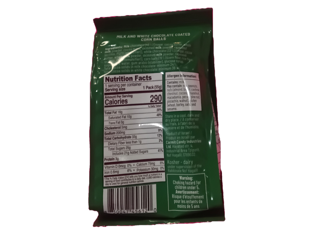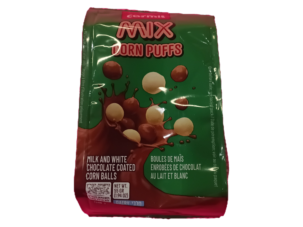 Carmit mix corn puffs milk & white choc coated, 1.94 oz