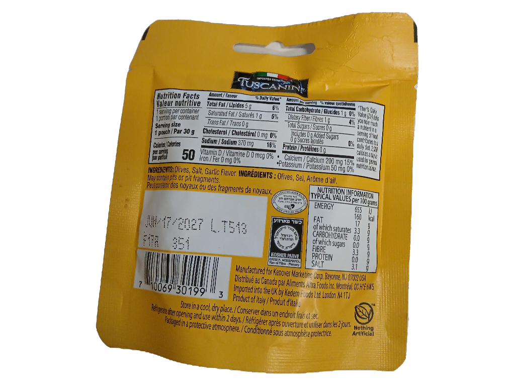 Tuscanni Garlic Pitted Olive Pouch, 1 Oz